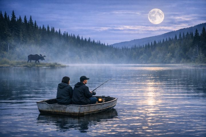 As darkness settled and the moist air lay fresh on my face, a moose appeared. But he stayed along the lake’s edge, dipping his head underwater for vegetation. Water lapped against our boat, gently rocking it. Crickets and frogs sang. Misty moonlight shimmered across the lake, reminding me of an old Jim Reeves song. So caught up in the moment, I launched into “In the Misty Moonlight” serenading my husband with all the vocal grace of a love‑sick goose battling seasonal allergies.