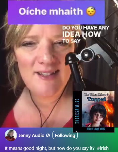 Check out Jenny’s great Irish accent! Click on the blue button below. She’s narrating “Trapped” audiobook 3 of The Taken Trilogy. We hope to have it ready for you before Thanksgiving.